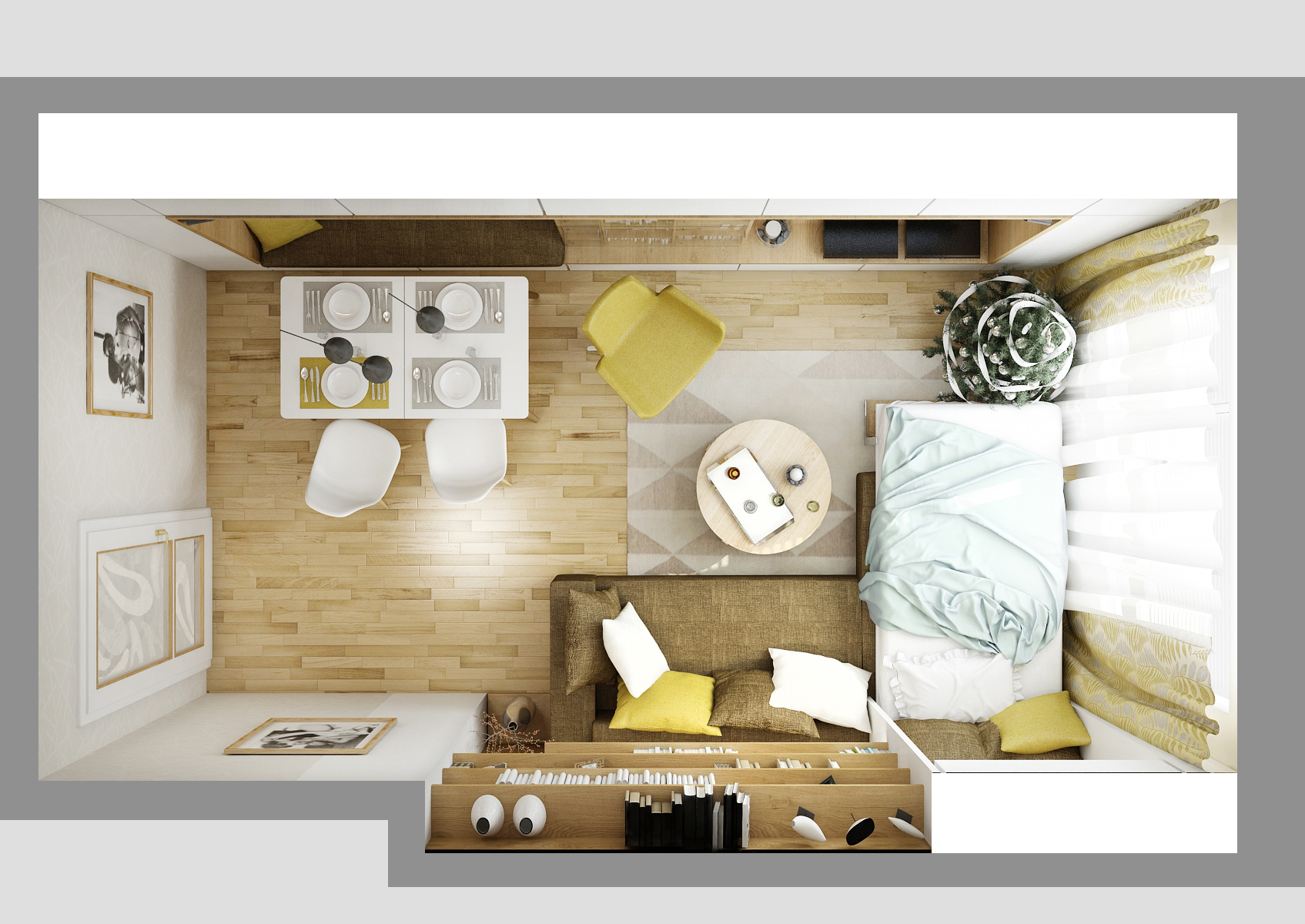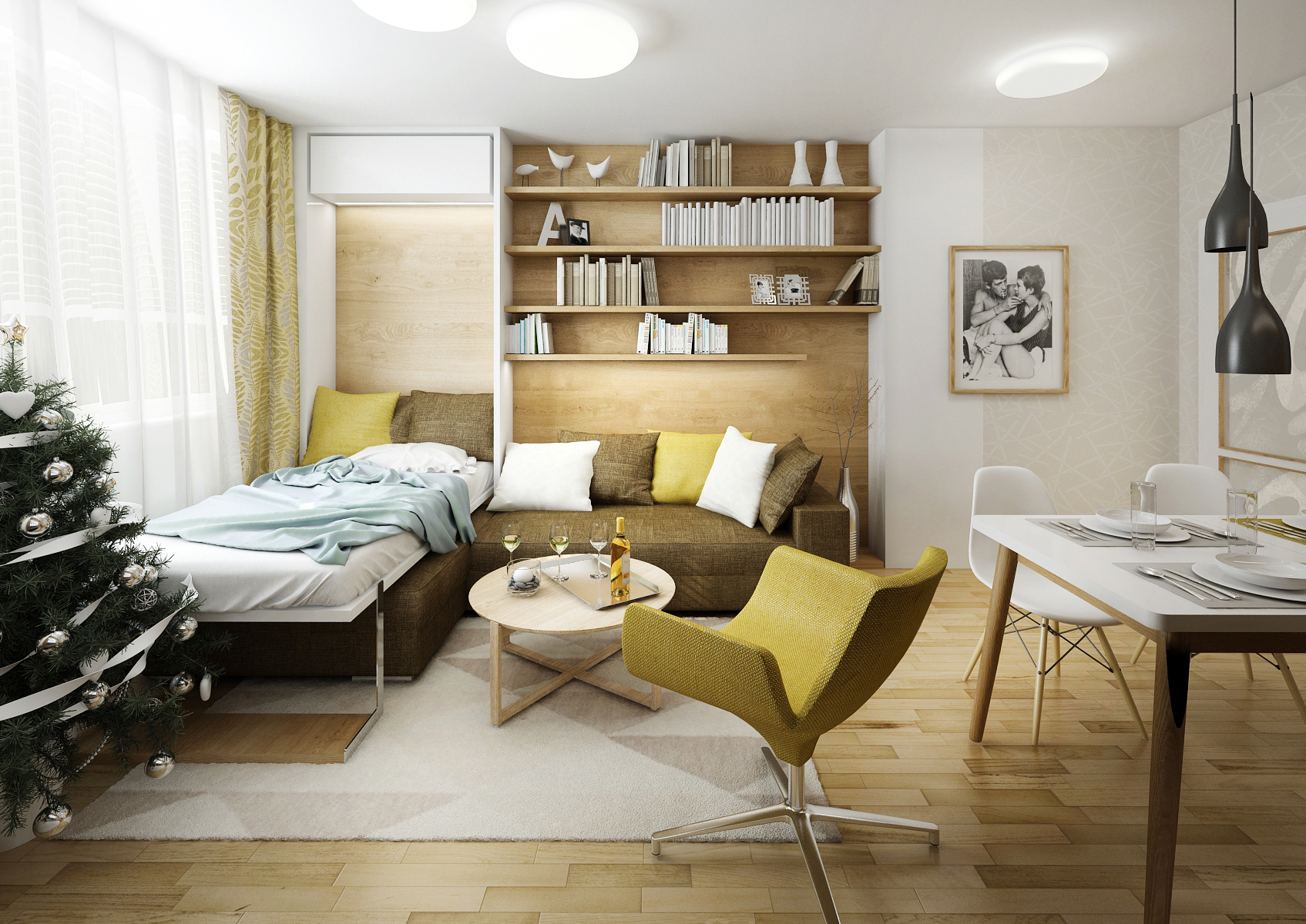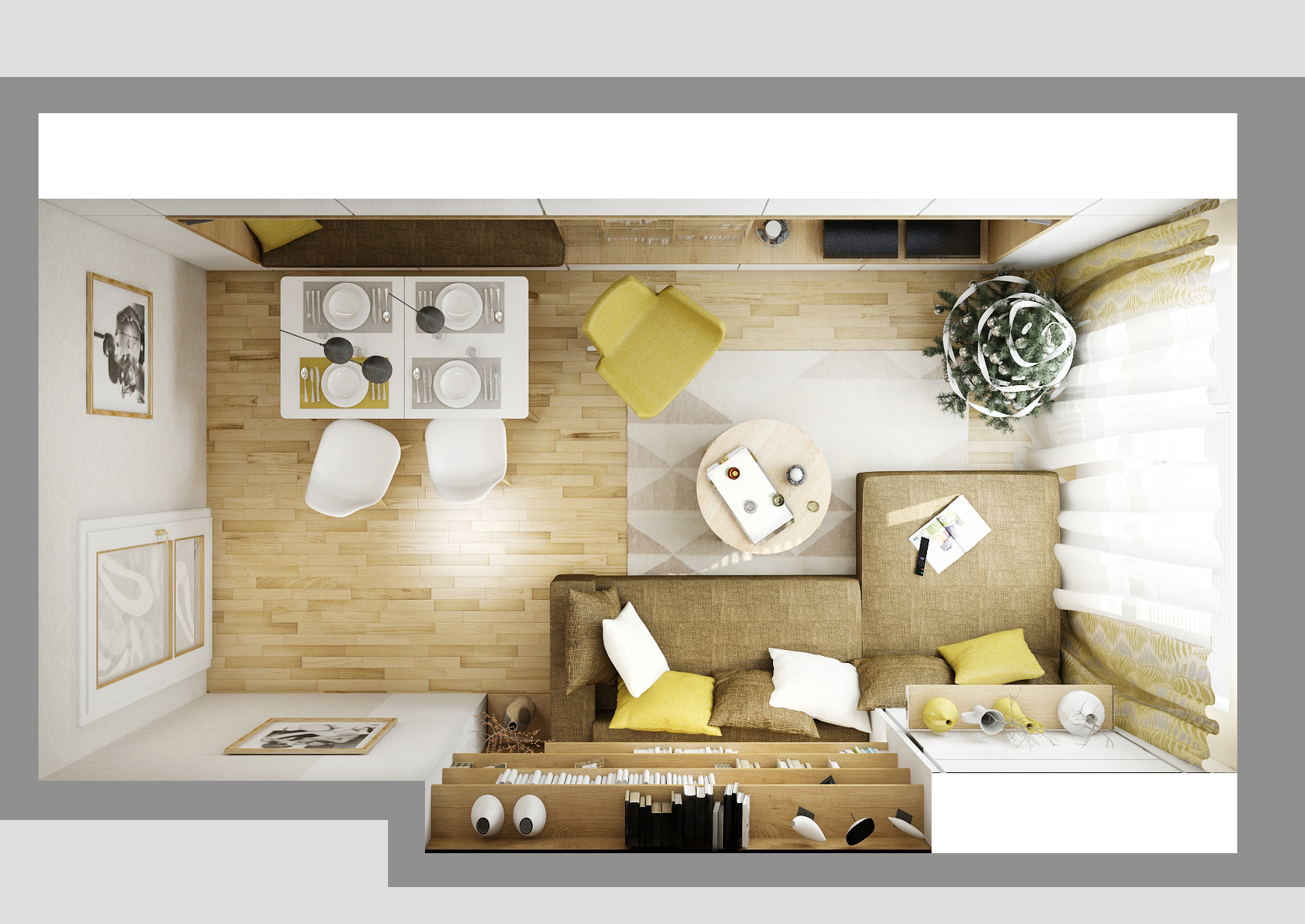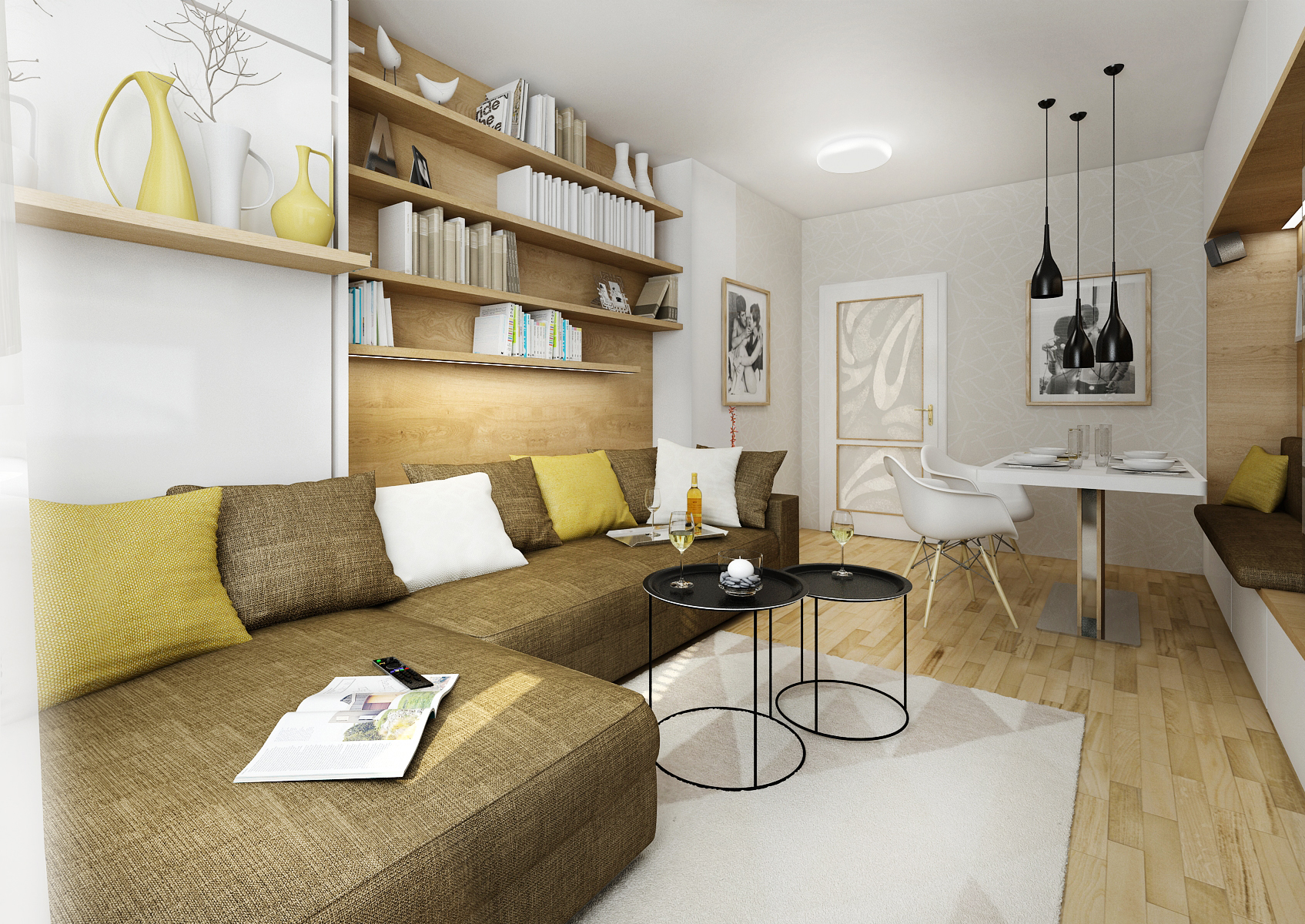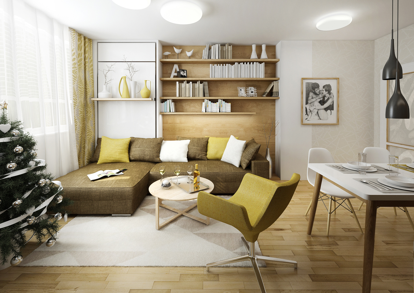 Living room with a sleepover option, this time on a non-traditional folding bed in a closet, folding over a sofa set.