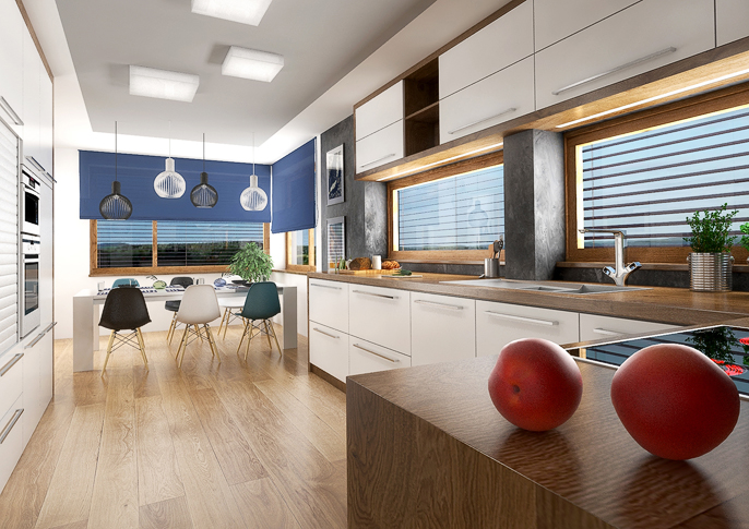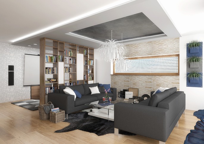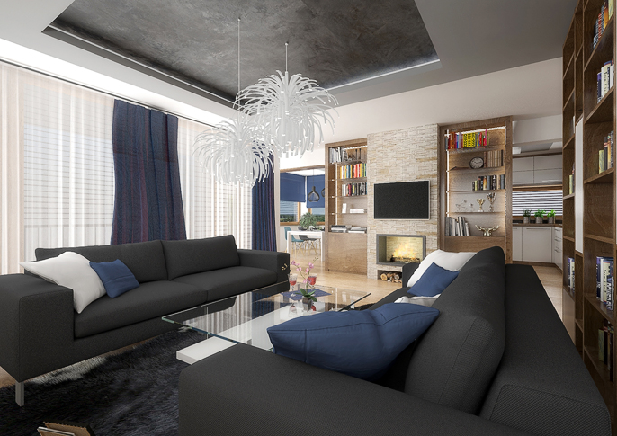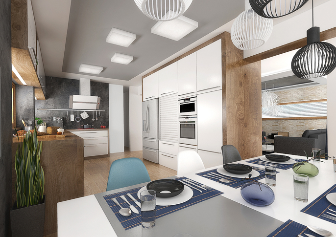 In this space, an anthracite trowel, white, oak wood decor and blue accessories are repeated in the living room and kitchen, which optically connects the two spaces. The open library creates a divide in the living room between the social area and the play area, which is used by children to play video games.