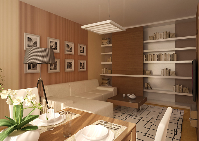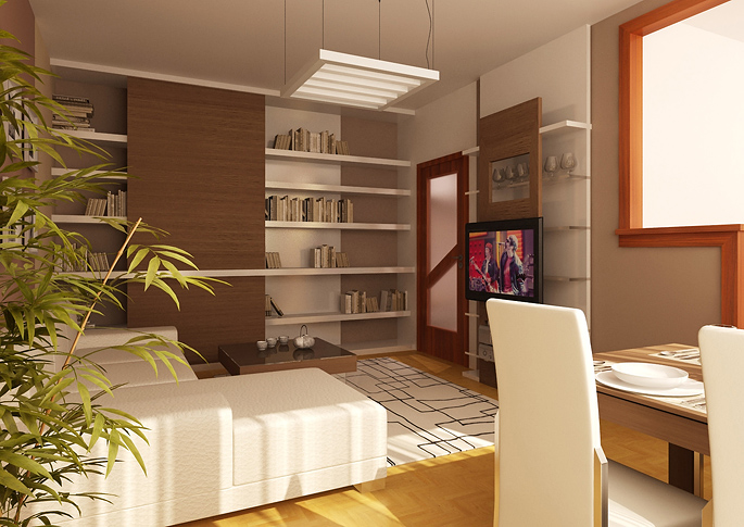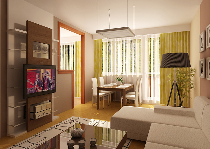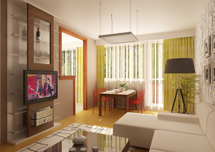 By reconstructing the living room in a panel house, a more cozy and practically better designed interior can be achieved. The rooms are dominated by a sofa, which separates the dining area. An important role is played by an open library with a sliding panel along the entire wall. The space is decorated in lighter colors thanks to white furniture and beige paintings. It also contains elements with dark wood decor. The interior is enhanced by decorations and accessories in orange and green.