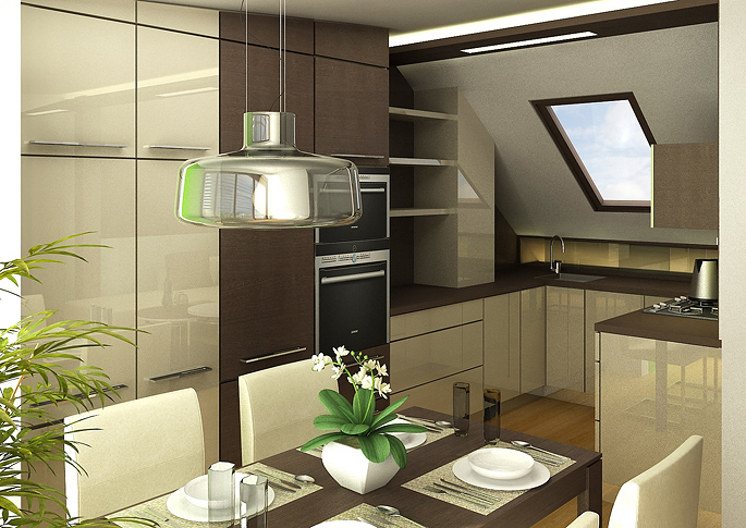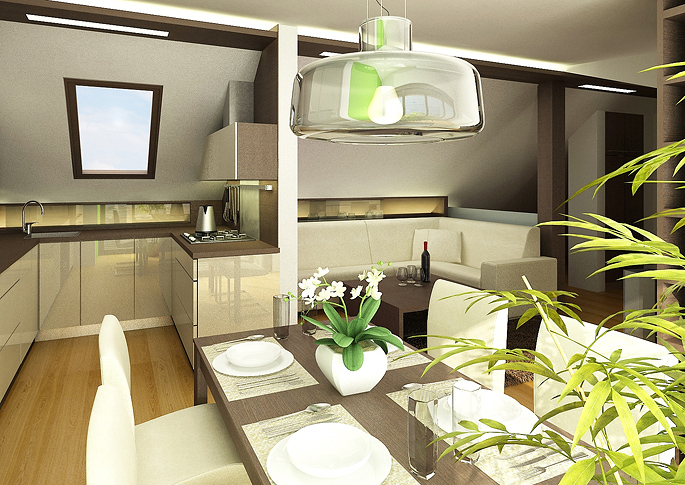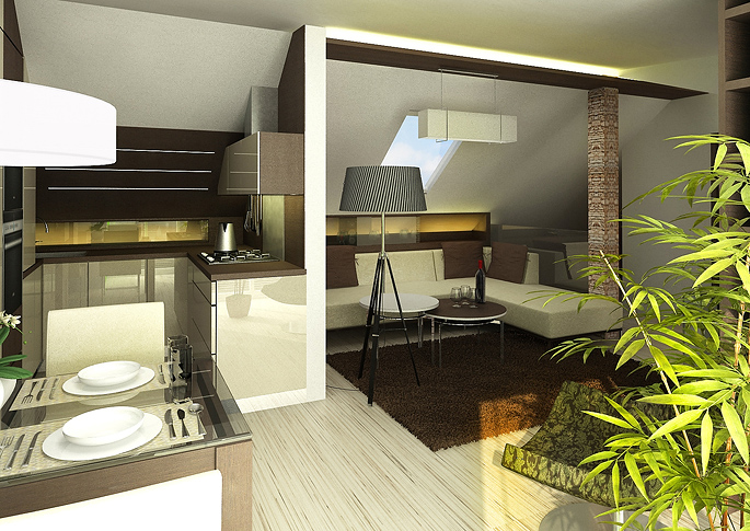 Modern design of an attic living room with kitchen