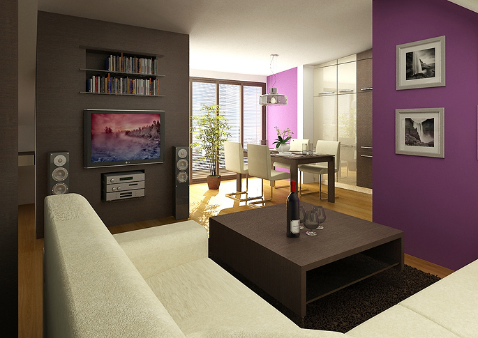 The living room is part of the interior design of the attic. Seating on the sofa by the TV is undisturbed thanks to the wall separations from the rest of the space. The room is designed in the same style and tuned to white color. A distinctive element is a dark brown wood decor of the furniture and beams. The space of the living room and kitchen is enhanced with a bold purple wall paint.