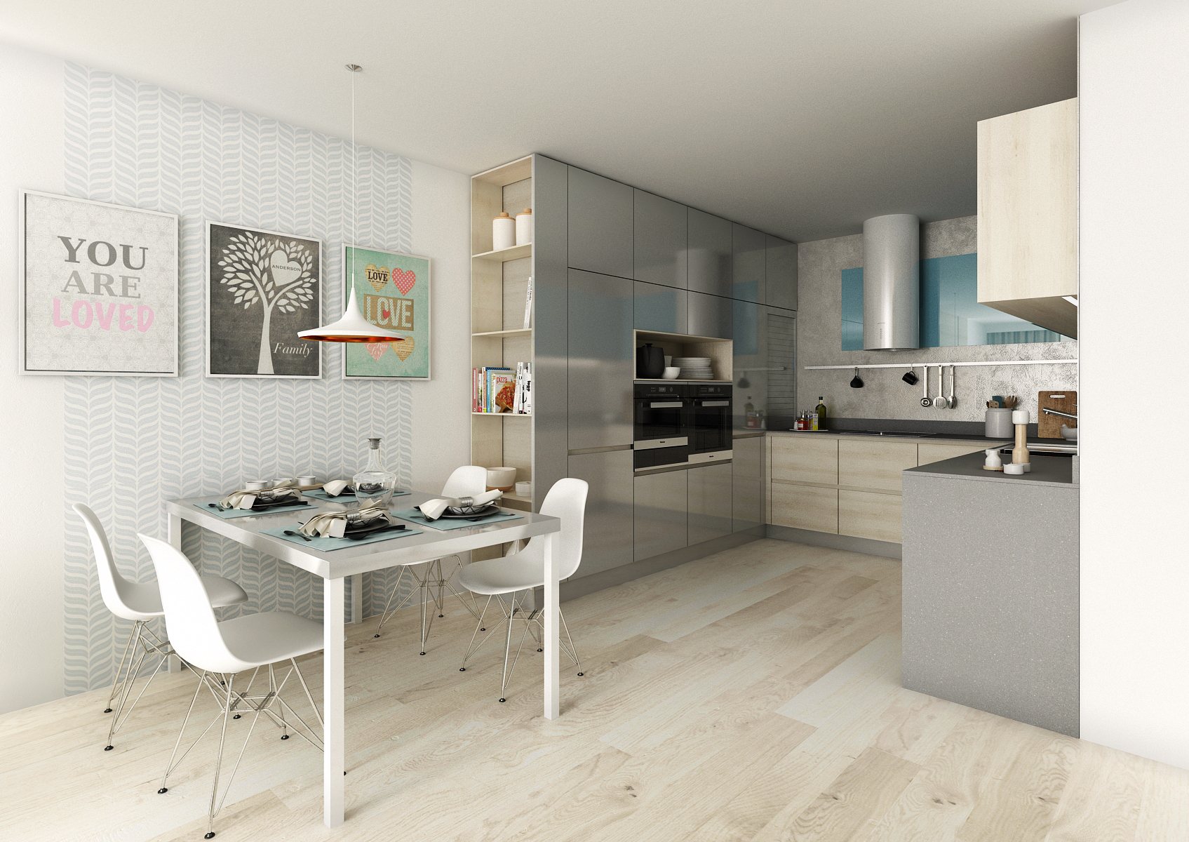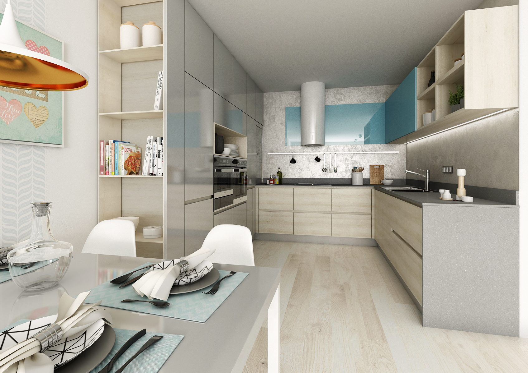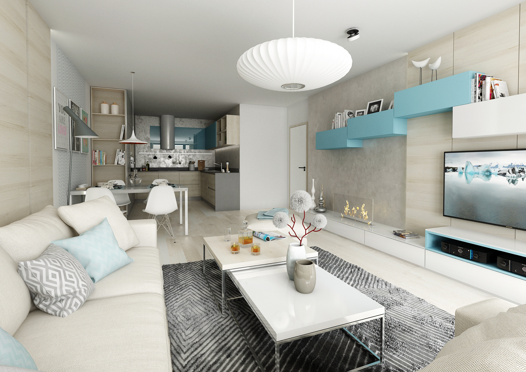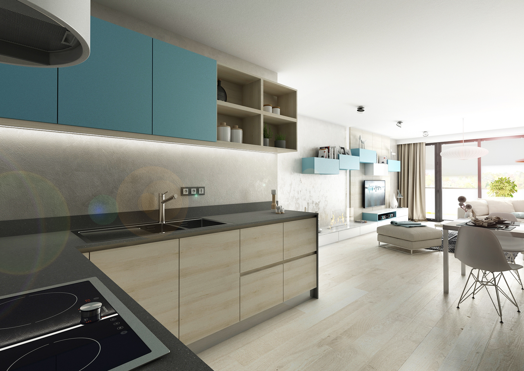 Three-room apartment with a kitchenette in a new building, we designed for the client in light neutral colors with an accent of turquoise blue. The furniture is decorated in a laminate of light oak, gray gloss and turquoise. The kitchen worktop is made of 12 mm thick Corian and the wall is modified with a durable decorative spatula.