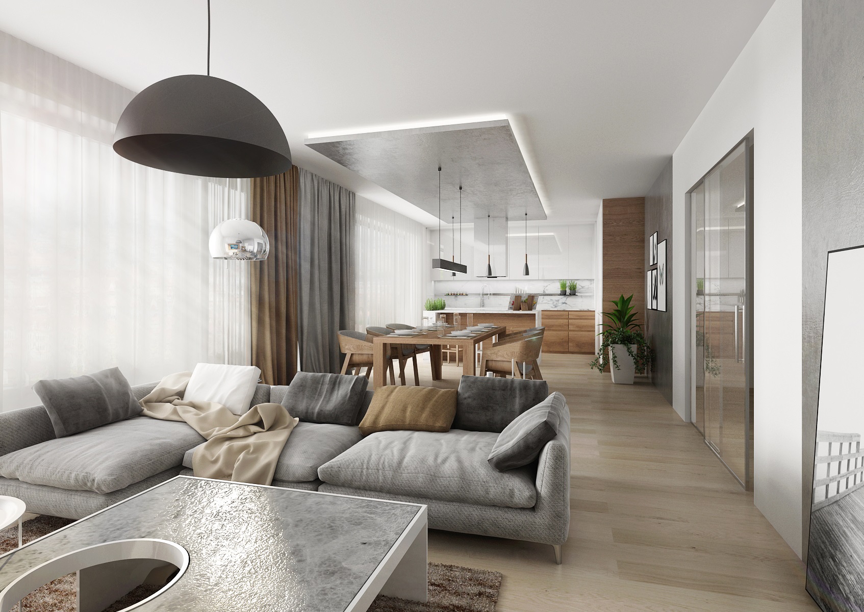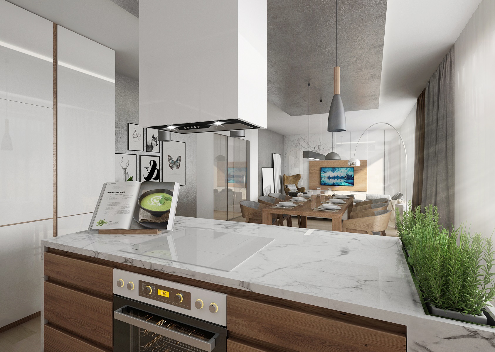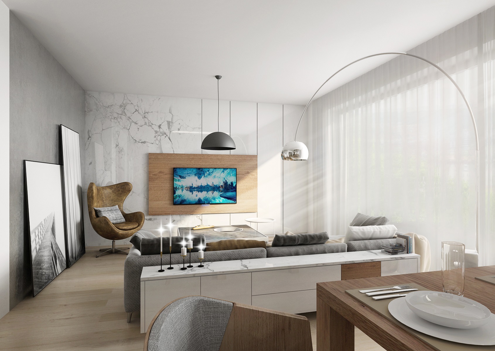 An example of this interior: worktop in the kitchen - postforming board or artificial stone, TV cladding - ceramic cladding, stone veneer or HPL laminate on the DTD base plate.