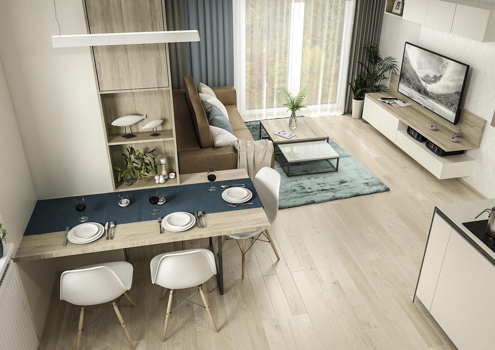 The interior is illuminated with both spotlights and designer pendant lights. Large windows in both the kitchen and the living room provide plenty of natural light.