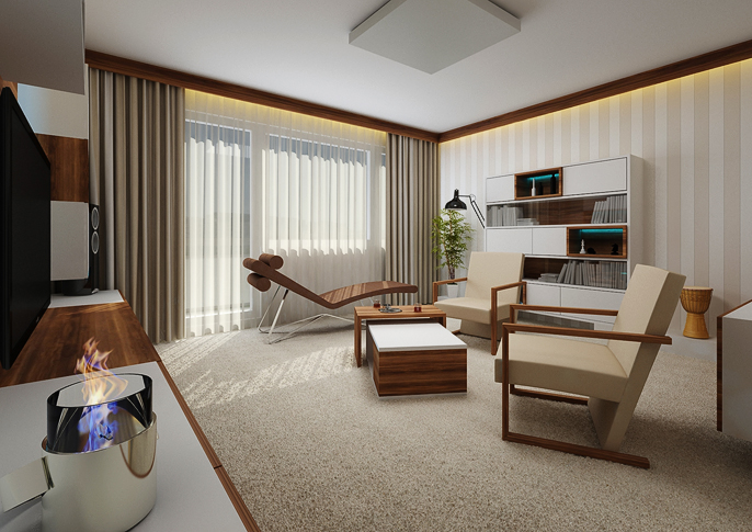 With a reconstruction of a living room in an apartment building, we can achieve a more cozy and practically better designed interior. The room is dominated by the sofa set, which separates the dining area from the rest. An important part of the rooms plays the open library with a sliding panel along the entire wall.