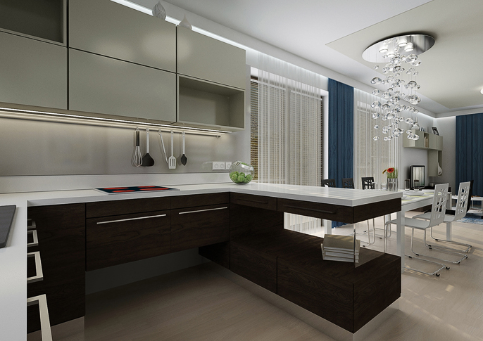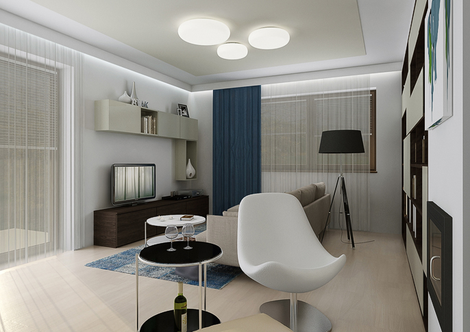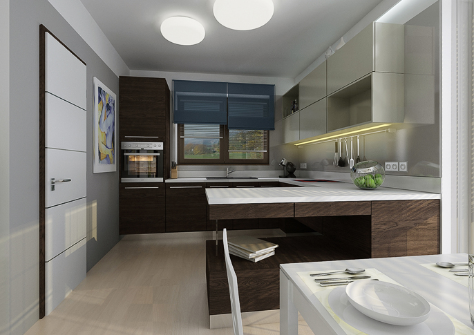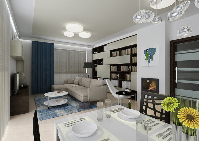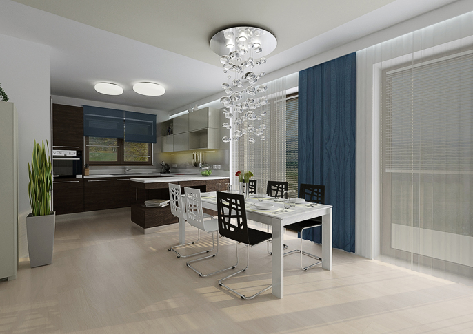 The bright space is designed in a cream color with dark blue accessories. An interesting element in the space is the atypically divided doors of the built-in library. The kitchen is tuned to darker tones. The kitchen worktop is in an oak stained nozzle in combination with white. Designer lamps above the dining table serve as decorations.
