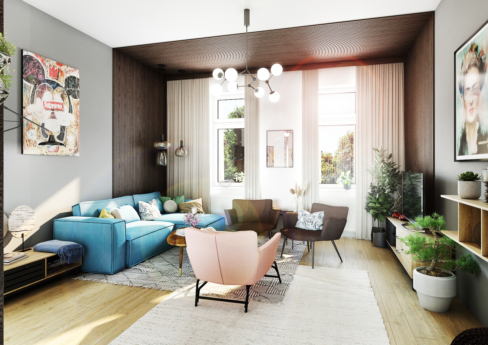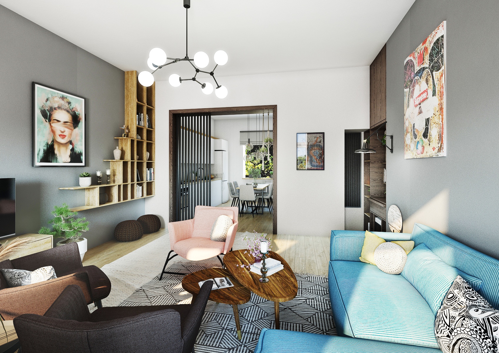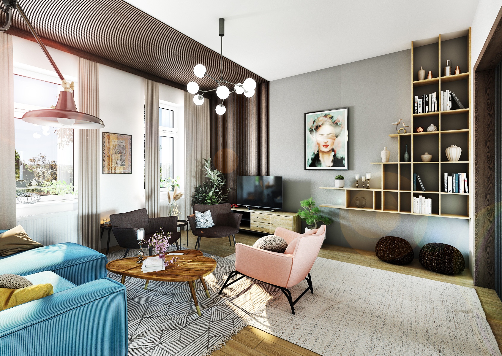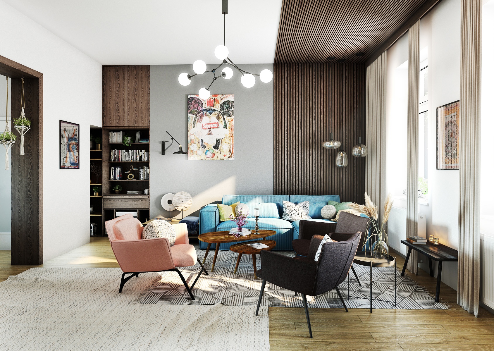 The living area is furnished with a stylish combination of pastel and neutral colors, where the dominant place is occupied by a comfortable light blue sofa complemented by colorful pillows that add liveliness to the space. An interesting feature is a wooden wall with vertical slats that add a certain depth to the space, while modern light fixtures and wall art add a distinctive charm. Furniture such as pink and dark brown armchairs, together with a unique coffee table made of natural wood, create a comfortable place to relax and meet.
