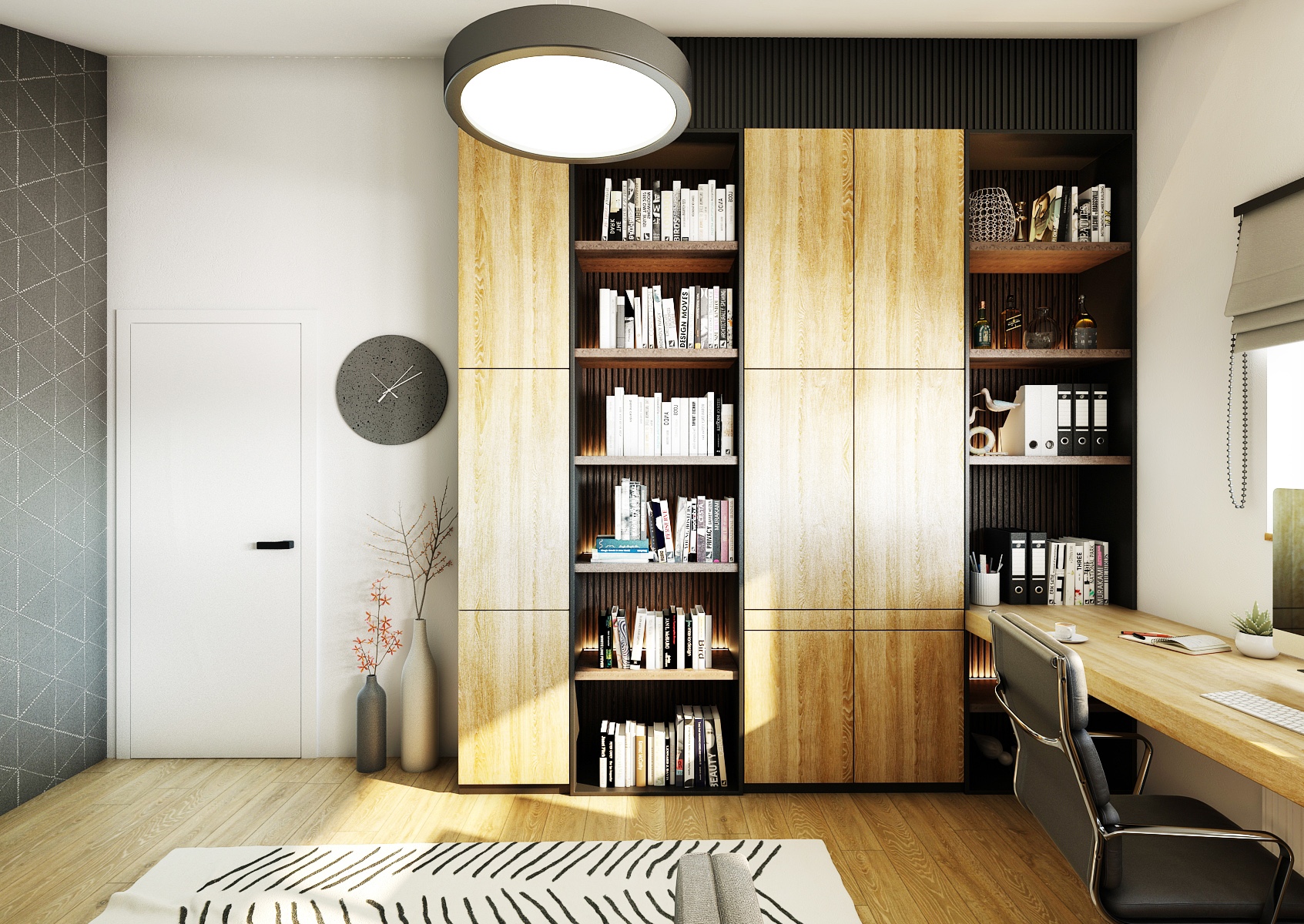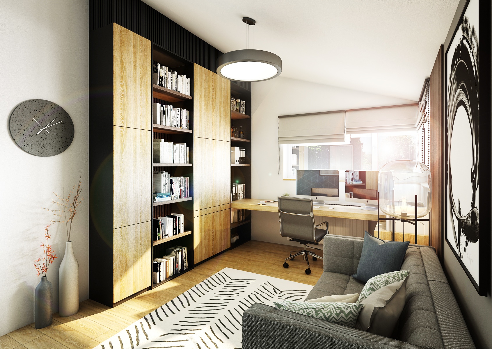 The office in this part of the house is designed with an emphasis on functionality and organization, while not losing its stylish appearance. A large desk placed under the window provides plenty of natural light, which is ideal for productive work. Tall bookcases with closed and open storage areas offer plenty of space for books and office supplies. A comfortable gray sofa serves as a relaxation zone, while modern decorations such as designer clocks and minimalist vases add aesthetic value to the space. This multifunctional space is a perfect example of how to combine work and living environments without compromising on comfort and style.