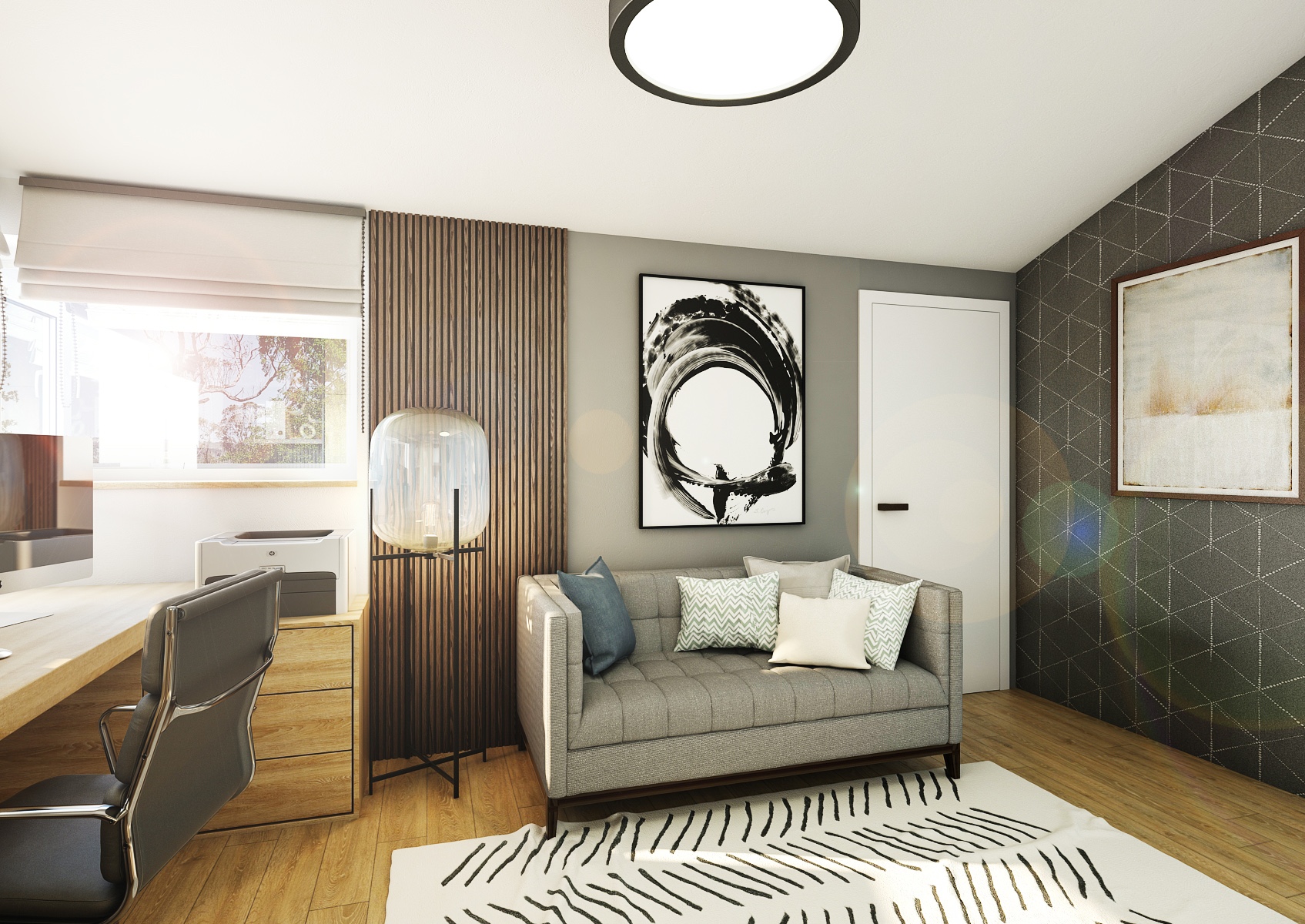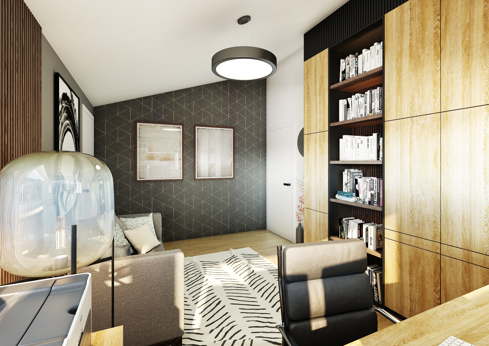 The living space with the office offers a harmonious combination of modern design and a cozy environment.